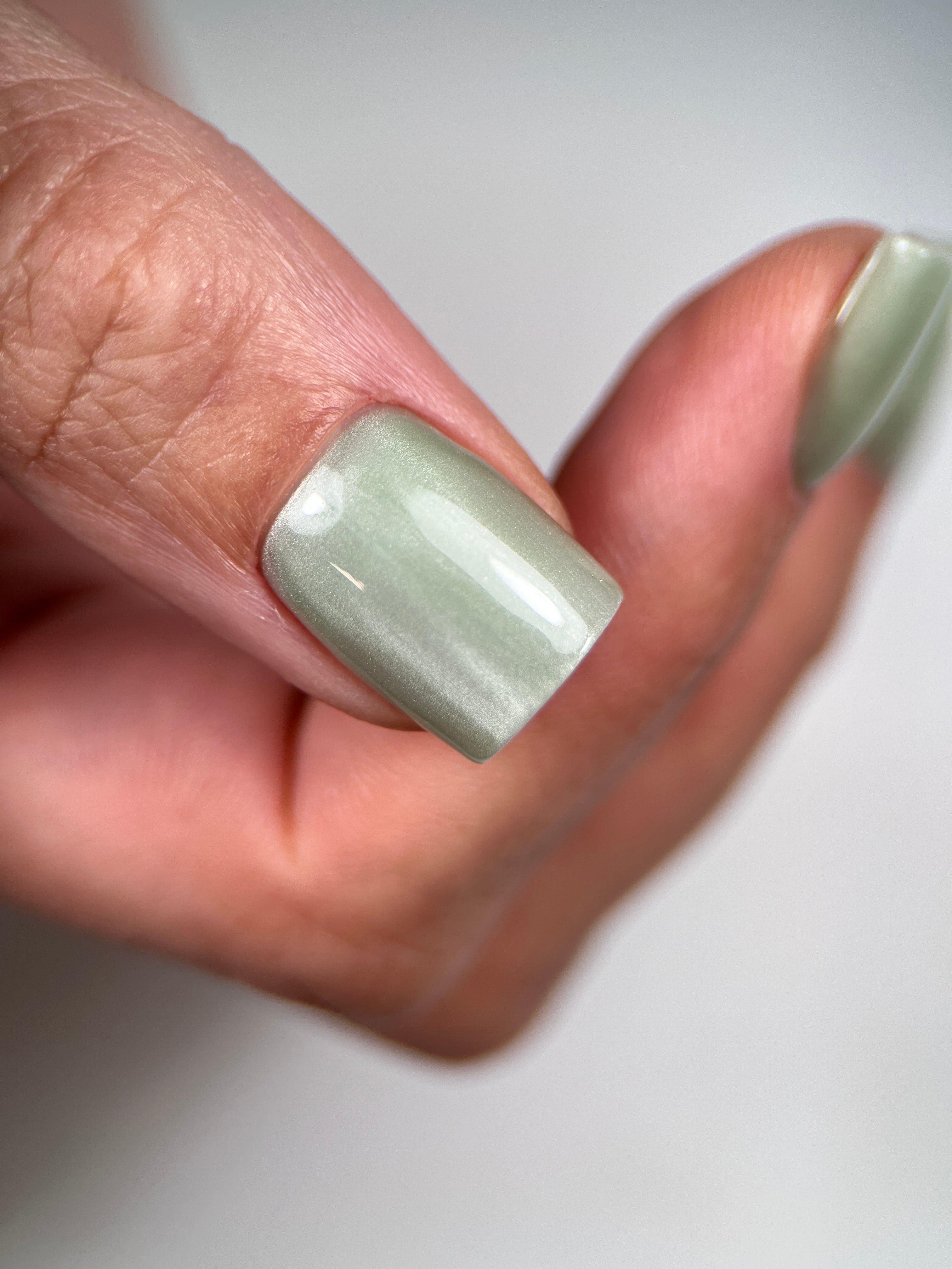 Take your nail art to the next level with the magnetic shimmer of Cat Eye Light Green Gel Polish. Use a magnetic wand to create: